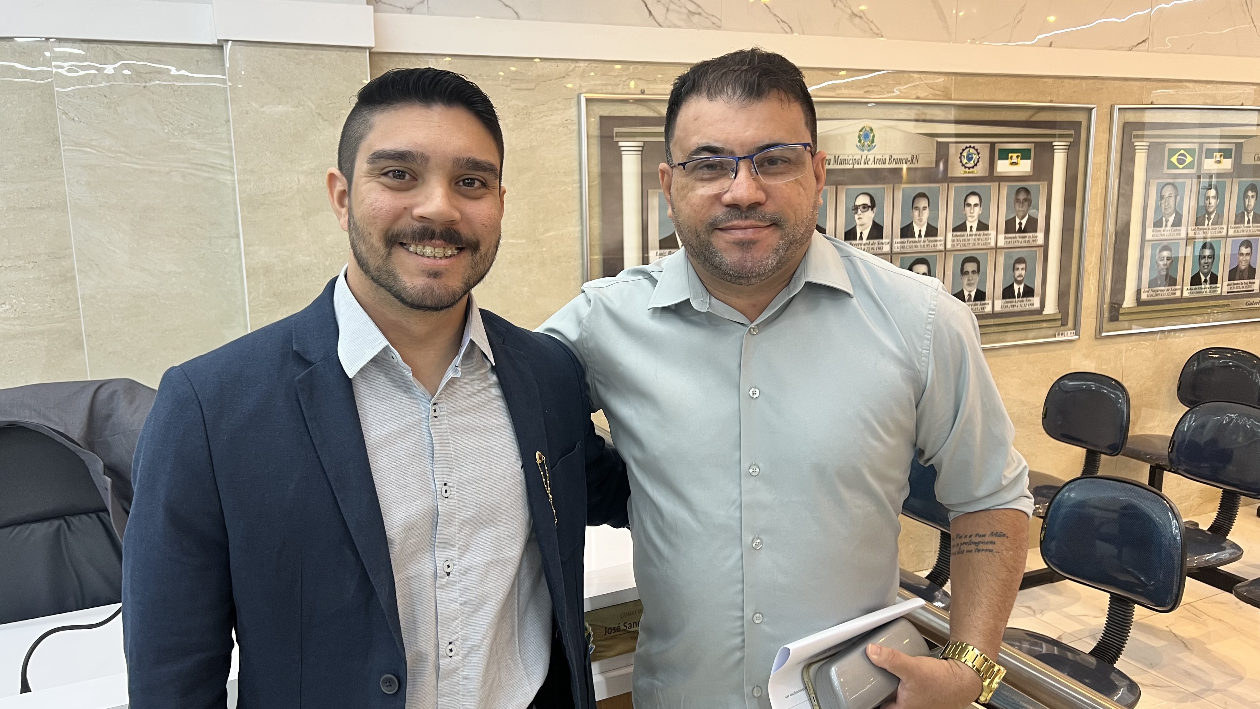 Imagem: Eilson Tavares e Sandro Góis após sessão ordinária e o Projeto de Lei ser aprovado a unanimidade pela Casa.