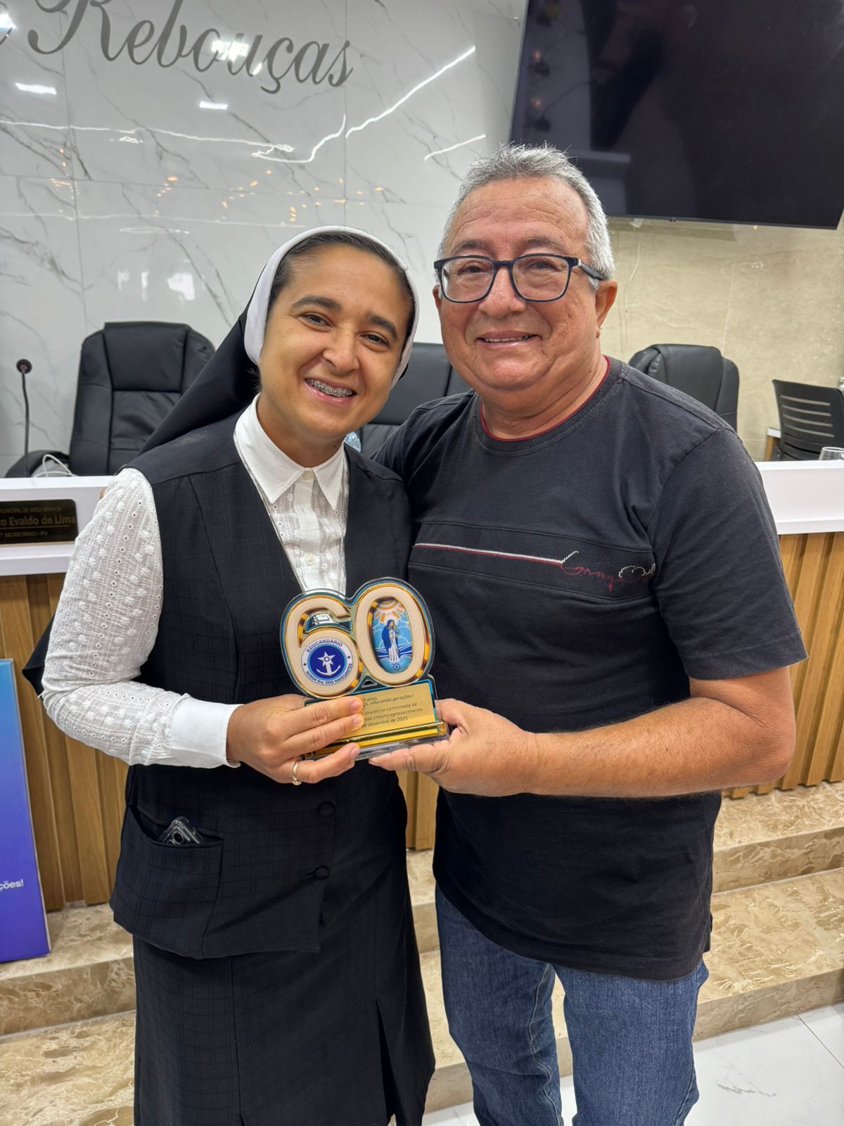 Durante a solenidade, um dos momentos mais significativos foi a entrega da Moção de Congratulações à irmã Maria José, que recebeu a honraria das mãos do vereador Sandro Góis, representando o Poder Legislativo. A homenagem reconheceu a dedicação, o compromisso e a contribuição da religiosa para a história e o fortalecimento da instituição ao longo dos anos.