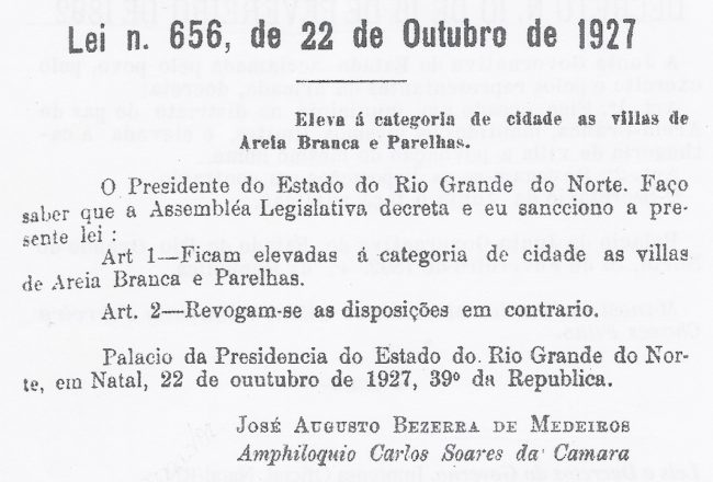 Em 22 de outubro de 1927, Areia Branca alcançava um importante capítulo em sua história: a vila, que já se destacava pelo crescimento urbano e relevância regional, foi elevada à categoria de cidade pela Lei nº 656, sancionada pelo então presidente do Estado do Rio Grande do Norte. O ato simbólico representou o reconhecimento do desenvolvimento urbanístico e social da localidade, embora não tenha alterado de imediato sua estrutura político-administrativa.