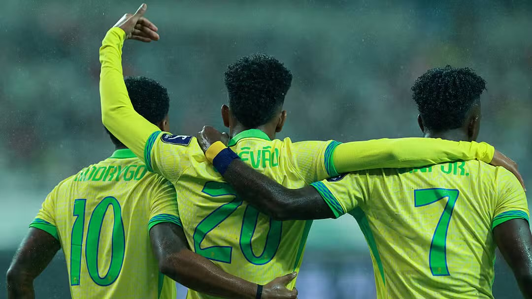 Imagem: Brasil entrou em campo com: Bento, Vitinho, Éder Militão, Gabriel Magalhães, Douglas Santos, Casemiro, Bruno Guimarães, Rodrygo, Matheus Cunha, Estevão e Vini Jr