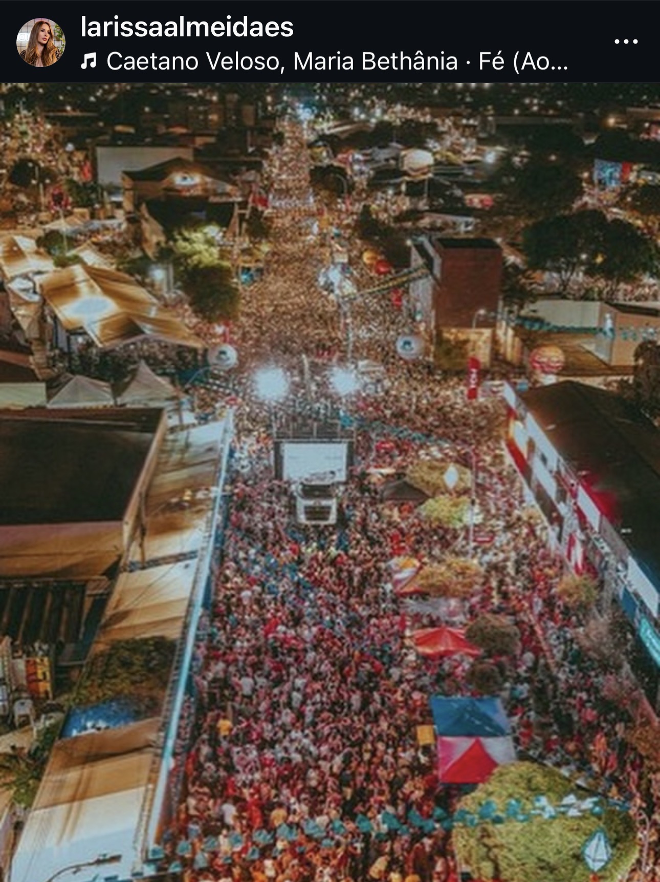 Em um texto de agradecimento pelo sucesso da artista durante o Carnaval deste ano, Larissa destacou a frase em caixa alta: “e agora que VENHA O SÃO JOÃO”. O detalhe que mais chamou a atenção dos seguidores foi o carrossel de fotos publicado junto ao texto: entre os registros, aparece exclusivamente uma imagem aérea do Pingo da Mei Dia, evento que abre oficialmente os festejos juninos na cidade e é considerado o maior bloco junino do Brasil.