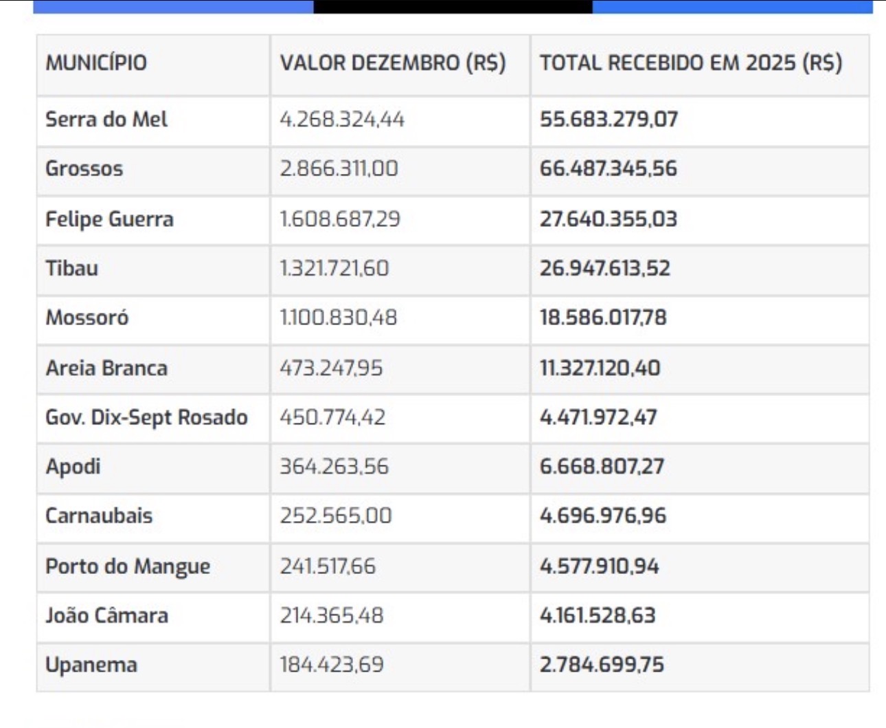 Serra do Mel lidera o repasse de dezembro, com R$ 4.268.324,44, e soma R$ 55.683.279,07 no ano. Outros municípios como Felipe Guerra (R$ 27,6 milhões), Tibau (R$ 26,9 milhões) e Mossoró (R$ 18,5 milhões) também aparecem com valores expressivos no acumulado de 2025.